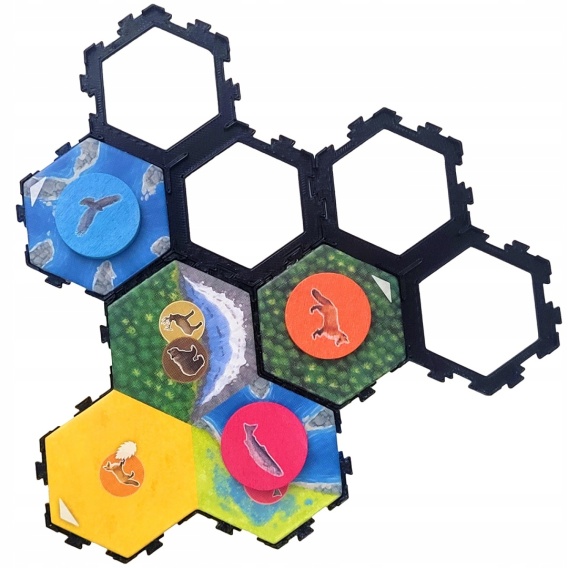Modułowa podstawka, która ułatwia rozmieszczanie kafelków biomów/zwierząt w grze Kaskadia. Dzięki niej pola nie będą się przypadkowo przesuwały podczas gry. Podstawki te łączą się ze sobą dzięki wypustkom. Kafelek biomów/zwierząt idealnie wypełniają modułową podstawkę, nie ma nadmiernego luzu. Jest lekki i wytrzymały. Łącznie można umieścić 3 pojedyncze kafelki biomów/zwierząt!