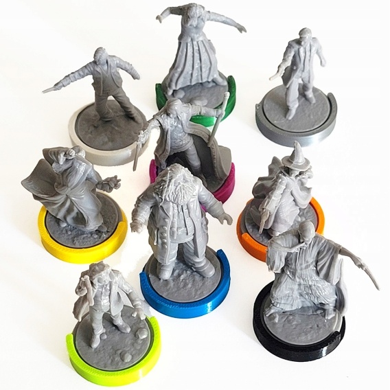 Zestaw zawiera komplet 9 szt. podstawek (9 kolorów po 1 szt.) pod figurki bohaterów. Podstawki po włożeniu figurki nie odpadają, można chwycić figurkę i przenieść razem z podstawką. Figurki z podstawkami można łatwo odróżnić na planszy + np. połączyć z planszetka gracza w tym samym kolorze (planszetki w rożnych kolorach dostępne na innych naszych aukcjach).