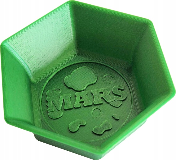 Zielony pojemnik na zielone znaczniki gracza. Na spodzie pojemnika trójwymiarowy klimatyczny znak planety z napisem Mars. Pojemnik ułatwia, porządkuje rogrywkę i pięknie prezentuje się na stole. Dzięki wyprofilowanym ku górze i zaokrąglonym krawędziom na zewnątrz i w środku pojemnika, znaczniki z łatwością dają się wyjąć. Pojemnik jest lekki i wytrzymały.